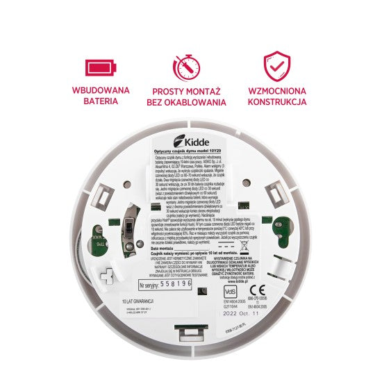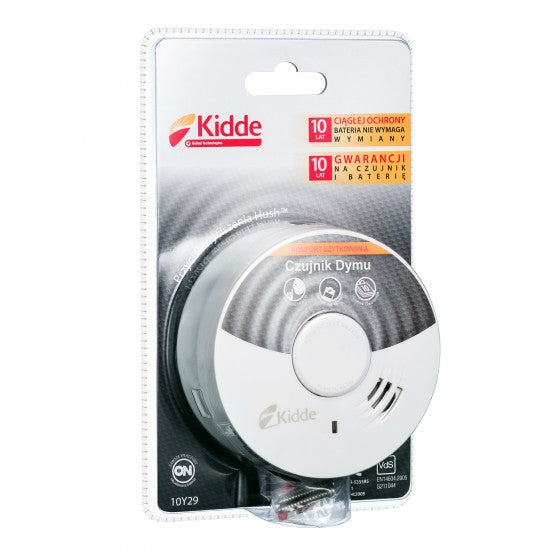 Optyczna czujka dymu 10Y29 z wbudowaną fabrycznie, niewymienną baterią gwarantującą 10 letni czas pracy urządzenia. Aktywacja zasilania następuje w momencie umieszczenia czujnika w uchwycie montażowym. Charakteryzuje się małymi wymiarami i nowoczesnym wzornictwem.