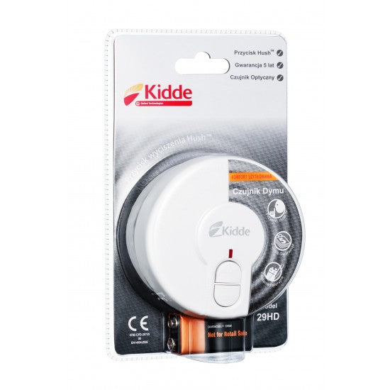 Optyczna czujka dymu 29HD zasilana z wymiennej baterii 9V, charakteryzująca się małymi wymiarami i nowoczesnym wzornictwem.