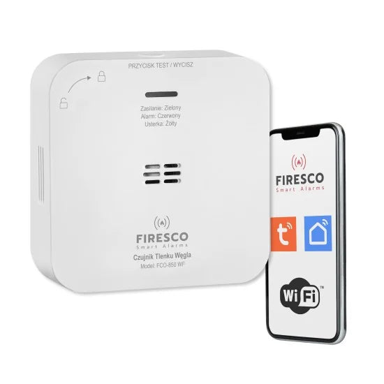 Czujnik tlenku węgla Firesco FCO-850 WF bazujący na sensorze elektrochemicznym o dużej dokładności i trwałości 10 lat. Posiada przycisk Test / Wycisz umożliwiający sprawdzenie działania urządzenia oraz wyciszenie fałszywych alarmów.