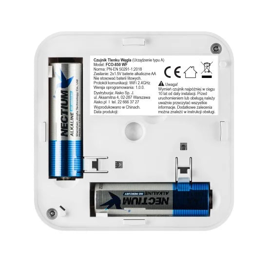 FCO-850 WF jest zasilany z 2 x 1.5V baterii alkalicznych, typu AA, dzięki czemu zapewnia ochronę również w przypadku zaniku napięcia zasilania w sieci. Po 10 latach od aktywacji zasilania czujnik przypomni o konieczności wymiany urządzenia.