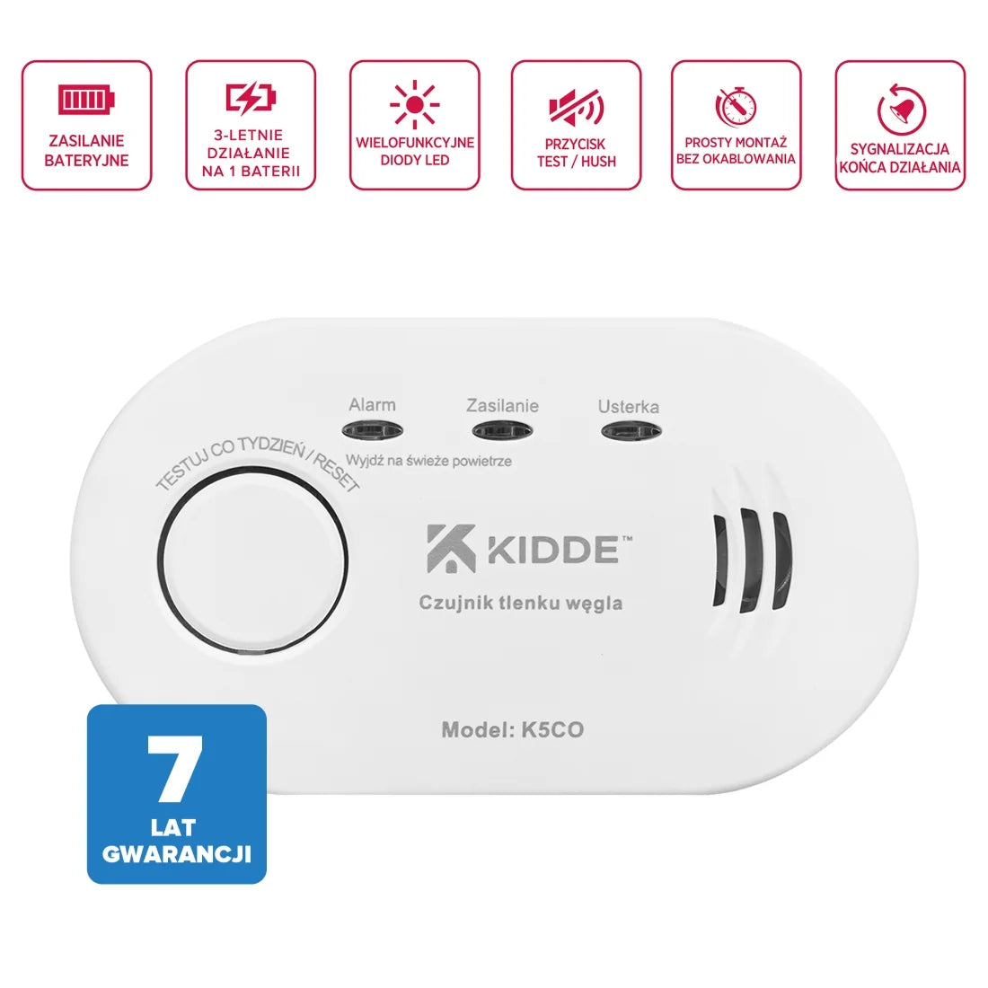 - Opatentowany elektrochemiczny czujnik CO firmy Kidde do detekcji czadu zapewnia 10 letnią pracę urządzenia
